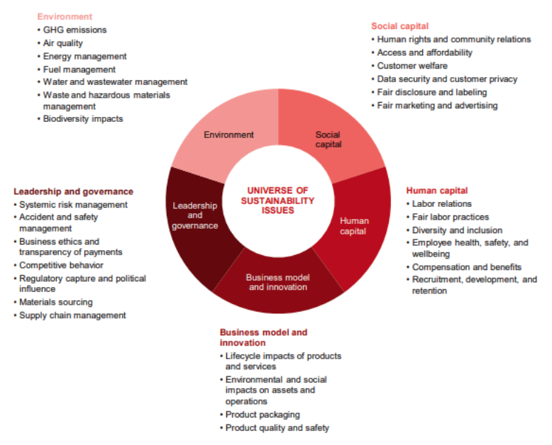 It also has a materiality map (SASB Materiality Map), which serves as a tool for investors and other capital providers to identify the most important financial issues in each industry. The map is divided into 26 sustainability topics organized under five ESG dimensions: Environmental Capital, Social Capital, Human Capital, Business Model and Innovation, and Leadership and Governance.